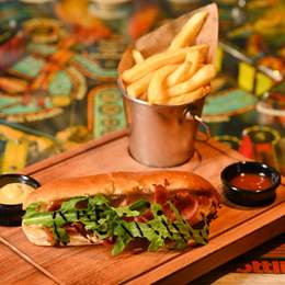 Pain brioché, saucisse de bœuf, bacon de bœuf, brie fondu, oignon caramélisé, roquette, sauce maison