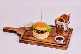 Pain brioché, bœuf haché, rondelles et compote de pomme, cheddar, iceberg, oignons caramélisés, tomate, sauce BBQ maison.