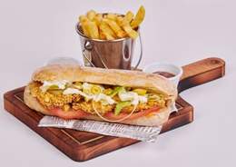 Pain brioché, Crevettes croustillant, Salade romaine, Tomate, Cheddar, Sauce tartare.