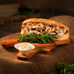 Pain brioché, bœuf haché, emmental, champignons de Paris, oignons à la plancha, roquette, tomate, sauce mayonnaise.