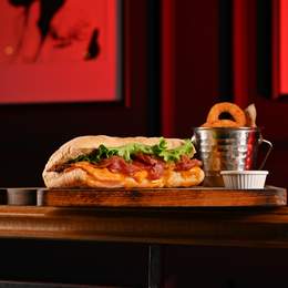 Bœuf haché, bacon de bœuf, iceberg, tomate, cheddar, sauce maison.