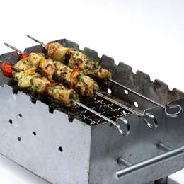 Brochettes de dinde grillées accompagnées de légumes sautés, sauce au poivron rouge et frites