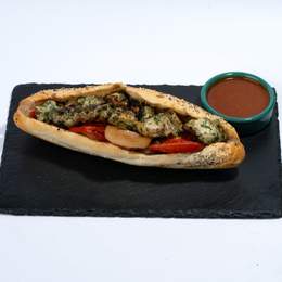Saucisse grillée, Tomate grillée, Oignons grillés, Sauce maison