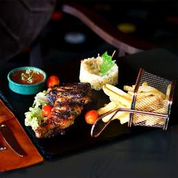 Poulet grillé, Tomate grillée, Oignons grillés, Sauce maison