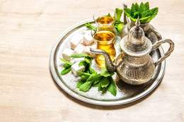 Thé à la menthe, jus d'orange, msemen, beghrir, miel, jben, huile d'olive, olives