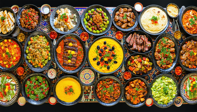 Poulet, sauce, oignons caramélisés, huile d'olive, épices marocaines, olives