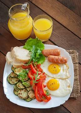 Jus d'orange, boule de céréale d'avoine, œuf au plat, fruit de saison, raisin sec, amande, lait frais, boisson chaude