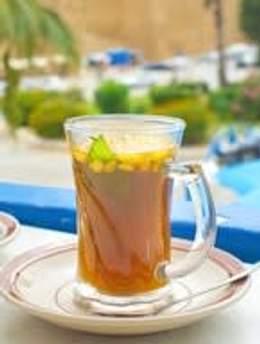 Soupe d'orge, omelette aux fines herbes ou des œufs au plat, petit salade, corbeille de pain pistolet, jus d'orange ou jus de carotte, grand verre de thé marocain, eau minérale