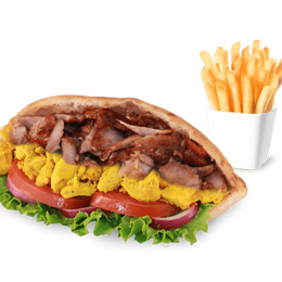 Chawarma, laitue, tomate, oignon, betterave, riz, pomme de terre