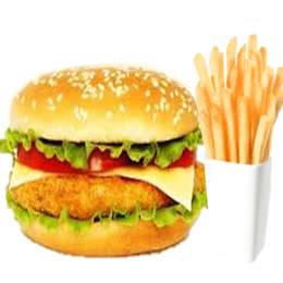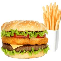1 steak haché de bœuf, 1 steak de poulet pané, deux tranches de fromage cheddar tomate, laitue