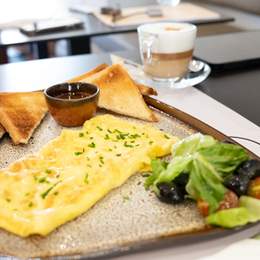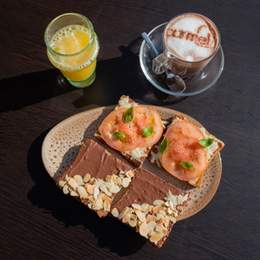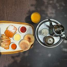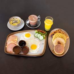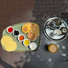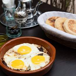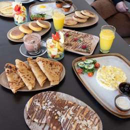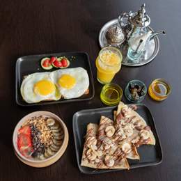 4 Hsoua ou Bissara. 4 Boisson Chaude & 4 Jus d’orange ou Jus de Carotte. 4 Msemen, 4 Baghrir, 4 Batbout, 4 Harcha. 2 Oeufs au choix. 2 Crêpes Nutella (3pcs), 2 Bols de Yaourt, Granola & Fruits de Saison, Panier de Viennoiserie (4pcs). Miel & Beurre & Olives Noires & Confiture & Huile d\'Olive