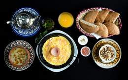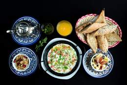Deux œufs au jambon de dinde et fromage, purée de tomates à l'espagnole, bissara, corbeille de pain, jben au thym, boisson chaude, raib aux fruits secs, jus d'orange pressé