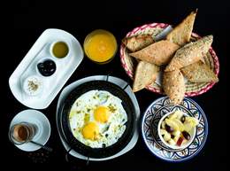 Deux œufs cuisson au choix, pain grillé, huile d'olive, jben au thym, olives noires, boisson chaude, salade de fruits frais, jus d'orange pressé