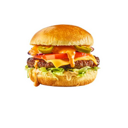 Burger de poulet, servi avec laitue fraîche, oignons, tomates, sauce frangos, jalapenos, sauce mexicaine épicée et fromage.