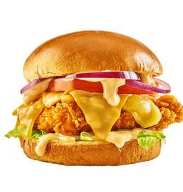 Burger de poulet, servi avec laitue fraîche, tomates, oignons, mayonnaise et fromage fondu américain spécial.