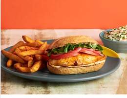 Tendre filet de poulet, croquant de laitue mixte, tomate fraîche tranchée, oignons rouges marinés et mayonnaise crémeuse