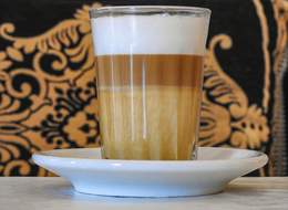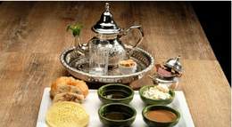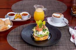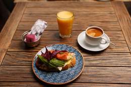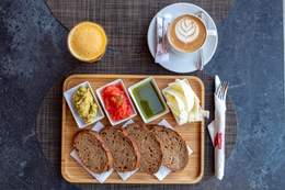 Boisson chaude et jus , corbeille de pain toasté, purée de tomates fraîches, manchego, tapenade d'olives vertes, pesto de persil, huile d'olives aux herbes