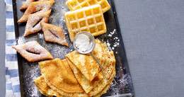 Boisson chaude et jus, 3 mini viennoiseries, corbeille de pain, beurre, confiture