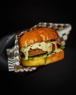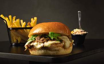 Bun maison, cheddar, tomate, oignons caramélisées, laitue, steak végétarien, et notre sauce truffle faite maison.