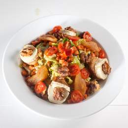 ( salade de mesclun, fromage de chèvre, noix, pommes caramélisées au miel, jambon de bœuf fumé, tomates cerises, pain de seigle, vinaigrette balsamique )