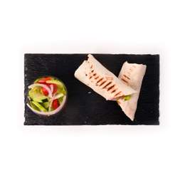 Blé, tomate, poivrons, oignons, haricots rouges, guacamole, mangue, mais, sauce vinaigrette pimentée