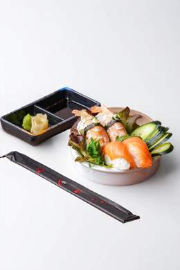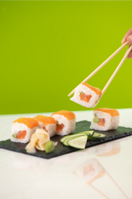 Feuille Nouri, riz, Saumon (6 pièces) servis avec sauce soja Maison