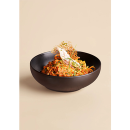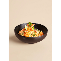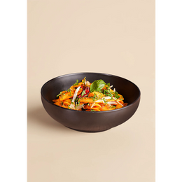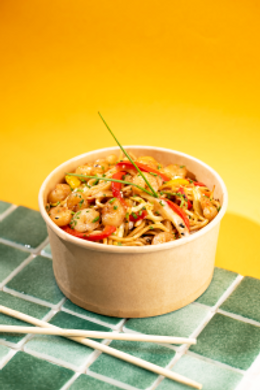 Base de nouilles, crevettes, carotte, chou, oignon, poivron cuisiné sauce soja et graine de sésame