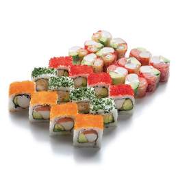 Crevette, riz vinaigre, surimi, avocat, mais, mangue, concombre