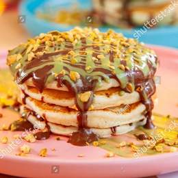 Crêpe remplie avec du pistache et du KOUNAFA, servie avec crème pistache, et grains de pistache et KOUNAFA