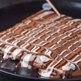 Crêpe remplie de Nutella et KOUNAFA, servie avec chocolat au lait et blanc miette d'oréo et KOUNAFA