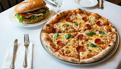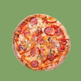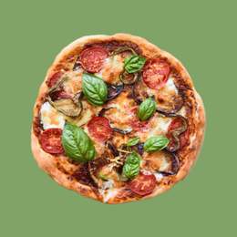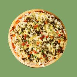 Sauce tomate, mozzarella, saucisse de bœuf, olives noires, pepperoni, oignons, origan