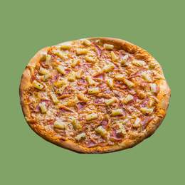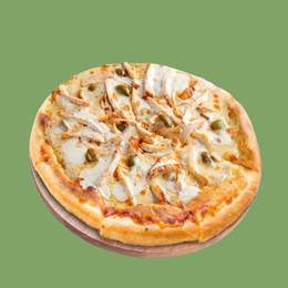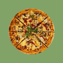 Sauce rose, mozzarella, jambon, poulet, pepperoni, origan, oignon, olives noires