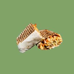 Tortilla garnie de deux viandes au choix, sauce, fromage et frites à l'intérieur