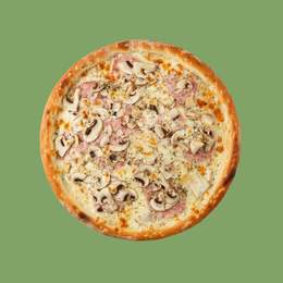 Sauce tomate, mozzarella, jambon fumé, œufs, origan, olives noires