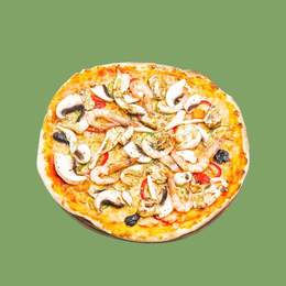 Sauce tomate, mozzarella, crevettes, calamars, champignons, origan, olives noires