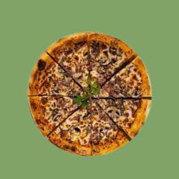 Sauce tomate, mozzarella, poivron, maïs, olives noires, thon, origan, oignon, piment fort