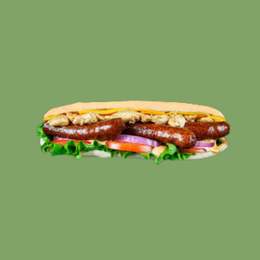 Pain garni de merguez grillées, salade, tomates et sauce au choix