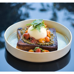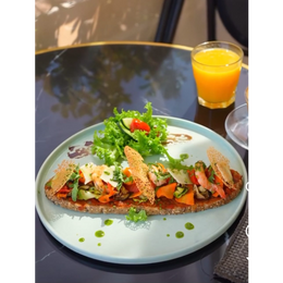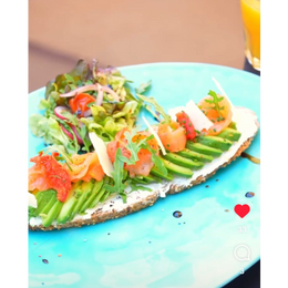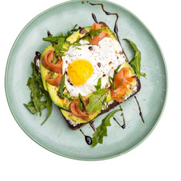 Brioche façon pain perdu, fromage frais à laneth, avocat saumon fumé, oeuf au plat,