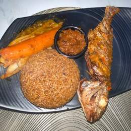 Poisson, riz parfumé, légumes frais et une sauce tomate épicée. Un classique sénégalais riche en saveurs, parfait pour les amateurs de fruits de mer.