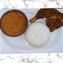 Poulet tendre, mijoté dans une sauce à base de pâte d'arachide, tomate et épices. servi avec du riz blanc.