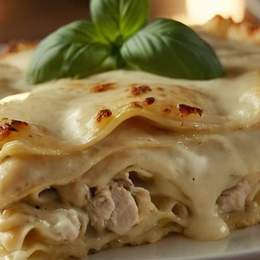 Couches de pâtes, poulet tendre émincé, champignons, béchamel onctueuse au parmesan, mozzarella gratinée au four.
