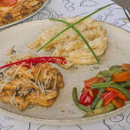 Fine tranche de poulet a la sauce champignons, penne, legumes sautés