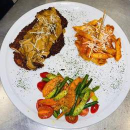 Fine tranche de Boeuf a la sauce champignons, penne, légumes sautés