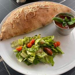 Pain cuit au feu de bois, tranches de poulet, mozzarelle, tomate, salade, oignons, sauce du chef