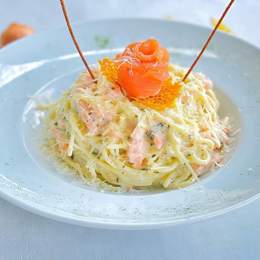 Crème parmesan, mozzarella, saumon fumé, avocat, tomates cerises, parmesan.