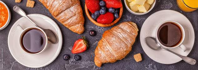 Petit pain, croissant, pain franc, boisson chaude, jus d'orange