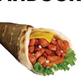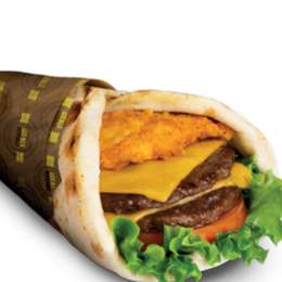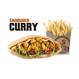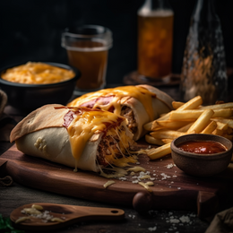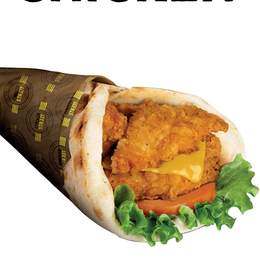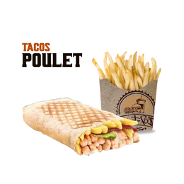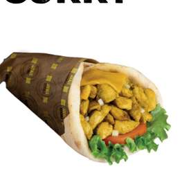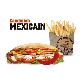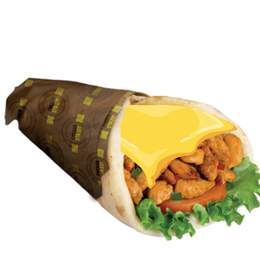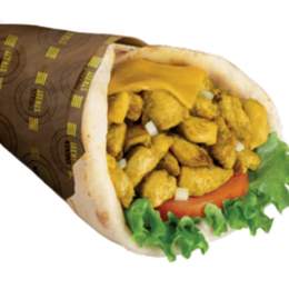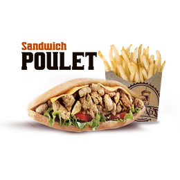 Pâte a pizza fraîche, shawarma, poulet pané, crudités, sauce fromagère maison, sauce au choix, gratiné au four, servi avec frites