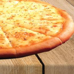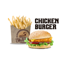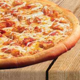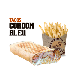 Pâte a pizza fraîche, escalope de poulet, cordon bleu, crudités, sauce fromagère maison, sauce au choix, gratiné au four, servi avec frites