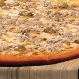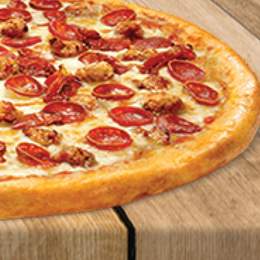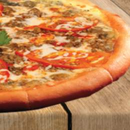 Pâte a pizza fraîche, viande hachée, escalope de poulet, oignons rings, oignons frit, servis avec potatoes potatoes
