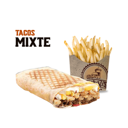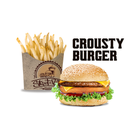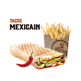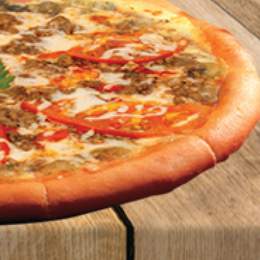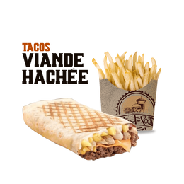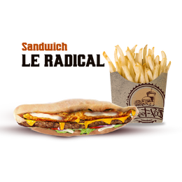 Pâte pizza fraîche, viande hachée, poivrons rouge et vert, crudités, sauce fromagère maison, sauce au choix, gratiné au four, servis avec frites